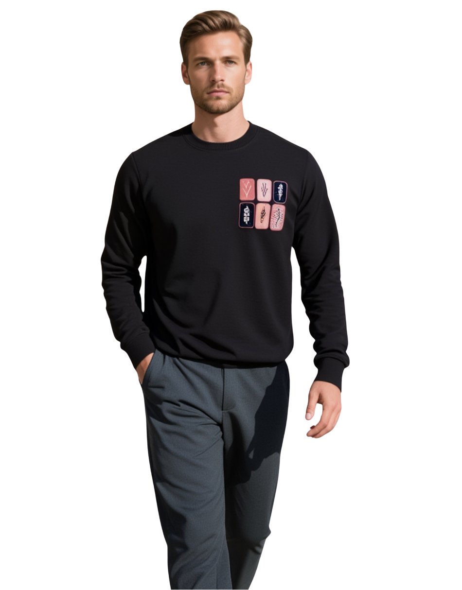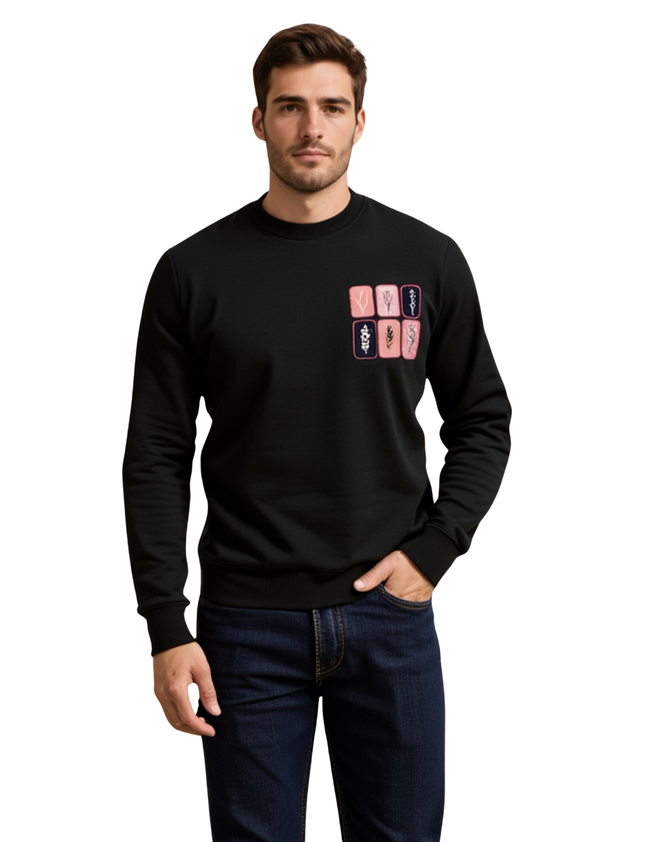 Siyah Erkek 3 iplik şardonlu baskılı sweatshirt, çiçek ve yaprak motifleri ile kış aylarında sıcak ve rahat kullanım sunar. Günlük, casual ve spor kombinler için ideal.