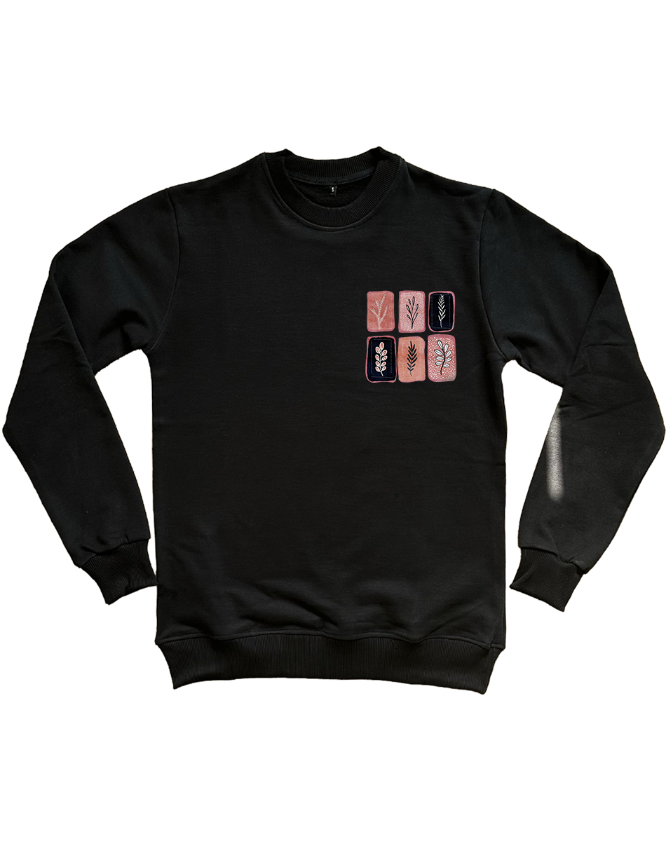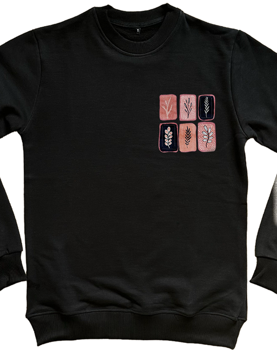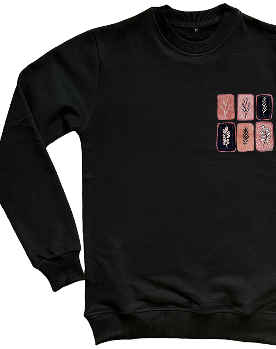 Siyah 3 İplik Şardonlu Baskılı Sweatshirt – Çiçek ve Yaprak Motifi | Kışlık Casual Yuvarlak Yaka